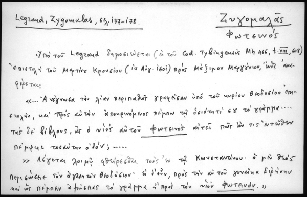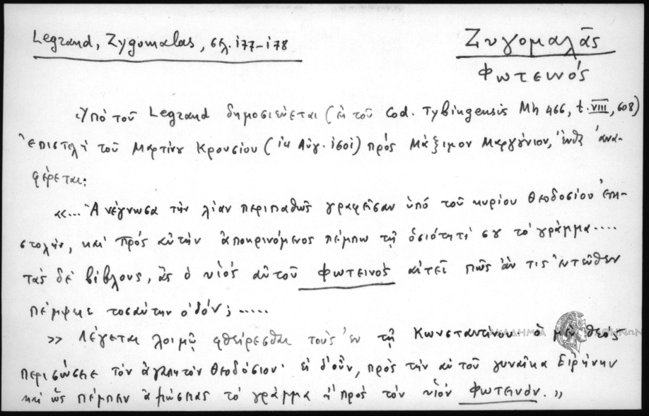 - Υπο του Legrand δημοσιεύεται (εκ του Cod. Tybingensis Mh 466, t. VIII, 608) επιστολή του Μαρτίνου Κρουσίου (14 Αυγ. 1601) προς Μάξιμον Μαργούνιον, ένθα αναφέρεται: «... Ανέγνωσα την λίαν περιπαθώς πέμπω τη οσιότητι σου το γράμμα... τας δε βίβλους, ας ο υιός αυτού Φωτεινός αιτεί πως αν τις εντεύθεν πέμψειε τοσαύτην οδόν;.... » Λέγεται λοιμώ φθείρεσθαι τους εν τη Κωνσταντίνου· ο μεν θεός περισώσειε τον αγαπητόν Θεοδόσιον· ει δ' ουν, προς την αυτού γυναίκα Ειρήνην και ως πέμπειν αξιώσειας το γράμμα ή προς τον υιόν Φωτεινόν.»