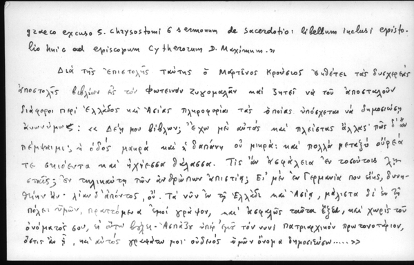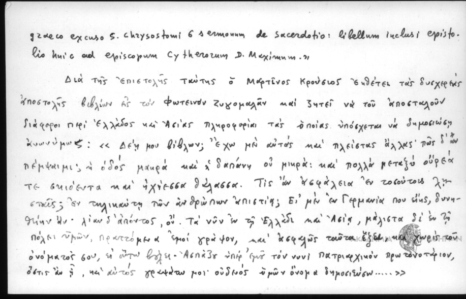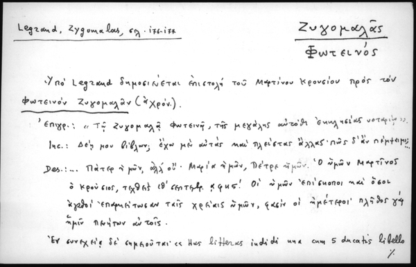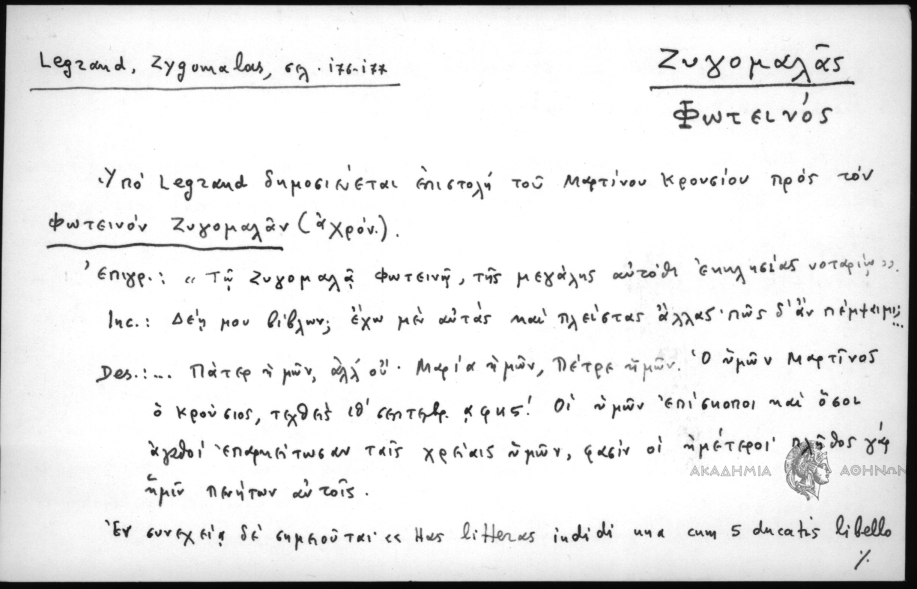 - Υπο Legrand δημοσιεύεται επιστολή του Μαρτίνου Κρουσίου προς τον Φωτεινόν Ζυγομαλάν (αχρόν.) Επιγρ.: «Τω Ζυγομαλά Φωτεινόν, της μεγάλης αυτόθι εκκλησίας νοταρίω». Inc.: Δέη μου βίβλων; έχω μεν αυτάς και πλείστας άλλας· πως δ' αν πέμψειμι; Des: ... Πάτερ ημών, αλλ' ου· Μαρία ημών, Πέτρε ημών. Ο υμών Μαρτίνος ο Κρούσιος, τεχθείς ιθ΄ σεπτεμβρ. ͵αφης΄. Οι υμών επίσκοποι και όσοι αγαθοί επαμείτωσαν ταις χρείαις υμών, φασίν οι ημέτεροι· πλήθος γαρ ημίν πενήτων αυτοίς. Εν συνεχεία δε σημειούται· «Has litteras indidi una cum 5 ducatis libello graeco excuso S. Chrysostomi G Sermounm de Sacerdotio: libellum inelusi epistolio huic ad episcopum Cytherorum D. Maximum.» Δια της επιστολής ταύτης ο Μαρτίνος Κρούσιος εκθέτει τας δυσχερείας αποστολής βιβλίων εις τον Φωτεινόν Ζυγομαλάν και ζητεί να του αποσταλούν διάφοροι περί Ελλάδος και Ασίας πληροφορίαι τας οποίας υπόσχεται να δημοσιεύση ανωνύμως: «Δεη μου βίβλων; έχω μεν αυτάς και πλείστας άλλας· πως δ' αν πέμψαιμι; η οδός μακρά και η δαπάνη ου μικρά: και πολλά μεταξύ ουρεά τε σκιόεντα και ηχίεσσα θάλασσα. Τις αν ασφάλεια εν τοσούτοις λησταίς; εν τηλικαύτη των ανθρώπων απιστία; Ει μεν εν Γερμανία που ειής, δυνηθείην αν· λίαν δ' απόντος, ον. Τα νυν εν τη Ελλάδι και Ασία, μάλιστα δε εν τη πόλει υμών, πραττόμενα εμοί γράψον, και ασφαλώς ταύτα έξει, και χωρίς του ονόματός σου, ει αυτώ βόλει. Ασπάξου υπέρ εμού τον νυνί πατριαρχικόν πρωτονοτάριον, όστις αν η και αυτός γραψάτω μοι· ουδενός υμών όνομα δημοσιεύσω...»