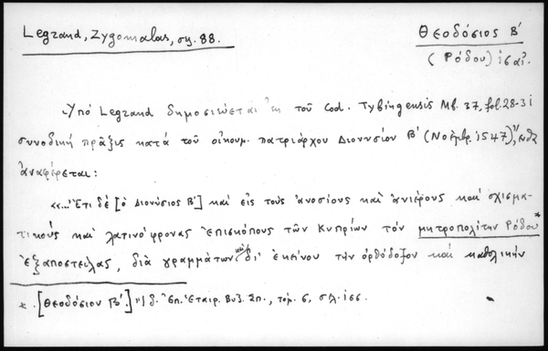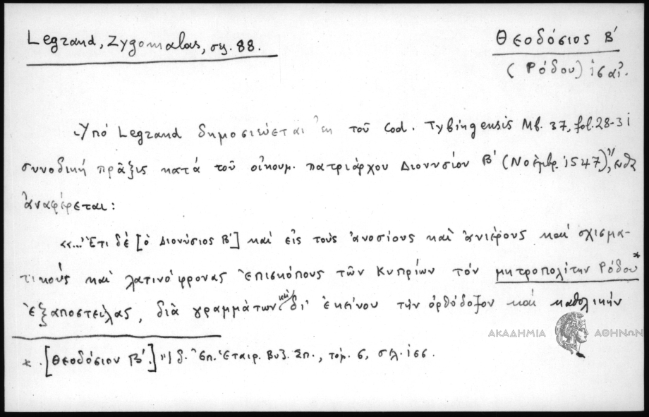 - Υπό Legrand δημοσιεύεται εκ του Cod. Tybingensis Mb. 37, fol 28-31 συνοδική πράξις κατά του οικουμ. πατριάρχου Διονυσίου Β΄ (Νοέμβρ. 1547), ένθα αναφέρεται: "...Έτι δε [ο Διονύσιος Β΄] και εις τους ανοσίους και ανιέρους και σχισματικούς και λατινόφρονας επισκόπους των Κυπρίων τον μητροπολίτην Ρόδου* εξαποστείλας, δια γραμμάτων και δι' εκείνου των ορθόδοξον και καθολικήν *.[Θεοδόσιον Β΄.] Ίδ. Επ. Εταιρ. Βυζ. Σπ., τόμ. 6, σελ. 166. εκκλησίαν αυτοίς ενώσαι προήρηται, ούσιν απεσχισμένοις κανονικώς υπ' αυτής της αγίας και οικουμενικής Έκτης συνόδου, δια τα αυτών εξάγιστα ατοπήματα."