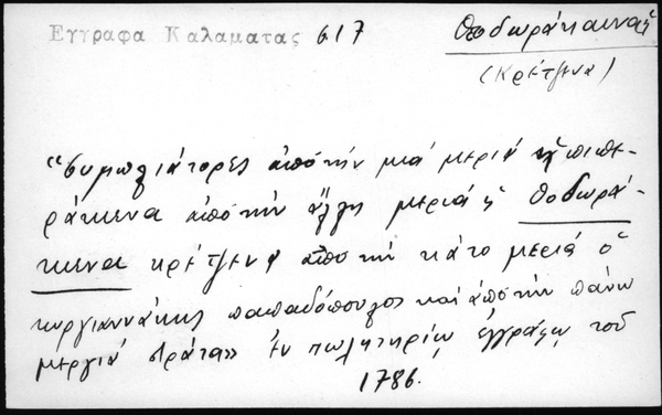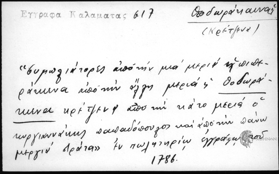 - "συμπλιάτορες από την μια μεριά κι πιπεράκενα από την άλλη μεριά η θοδωράκενα κρέτζενα από την κάτο μεριά ο κυργιαννάκης παπαδόπουλος και από την πάνω μεργιά στράτα" Εν πωλητηρίω εγγράφω του 1786.