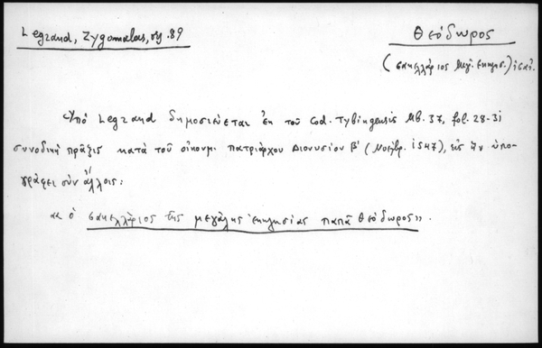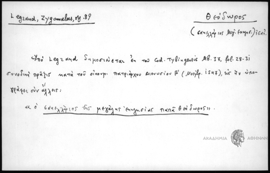 - Υπό Legrand δημοσιεύεται εκ του Cod. Tybiugensis Mb.37, fol. 28-31 συνοδική πράξις κατά του οικουμ. πατριάρχου Διονυσίου Β΄(Νοέμβρ. 1547), εις ην υπογράφει συν άλλοις: "ο σακελλάριος της μεγάλης εκκλησίας παπά Θεόδωρος".