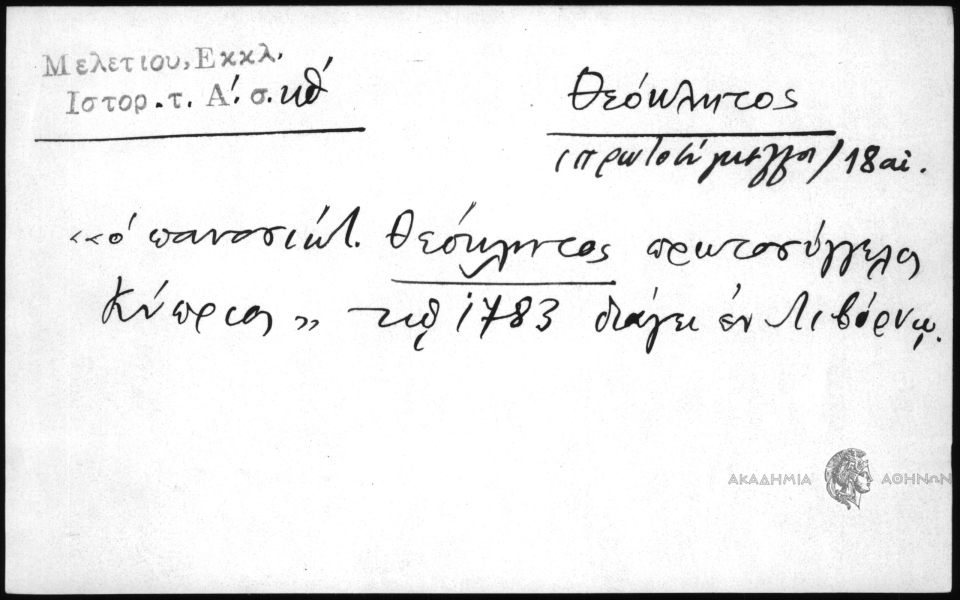 Εκκλησιαστική ιστορία Μελετίου μητροπολίτου Αθηνών. Μετενεχθείσα εκ της ελληνικής εις την ημετέραν απλοελληνικήν φράσιν εις τόμους τρεις... πλουτισθείσα με ... υποσημειώσεις και ... πίνακας παρά Γεωργίου Βενδότη εκ Ζακύνθου... νυν πρώτον τύποις εκδοθείσα δι΄ επιστασίας... Πολυζώη Λαμπανιτζιώτη του ε…