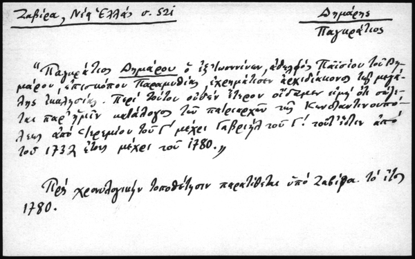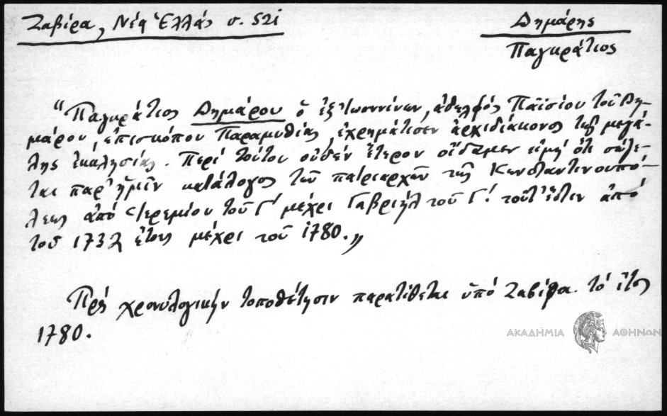 - Παγκράτιος Δημάρου ο εξ' Ιωαννίνων, αδελφός Παϊσίου του Δημάρου, επισκόπου Παραμυθιάς, εχρημάτισεν αρχιδιάκονος της μεγάλης εκκλησίας. Περί τούτου ουδέν έτερον οίδαμεν ειμή ότι σώζεται παρ' ημίν κατάλογος των πατριαρχών της Κωνσταντινουπόλεως από Ιερεμίου του Γ' μέχρι Γαβριήλ του Γ! τουτ' έστιν από του 1732 έτους μέχρι του 1780." Προς χρονολογικήν τοποθέτησιν παρατίθεται υπό Ζαβίρα το έτος 1780.