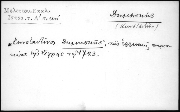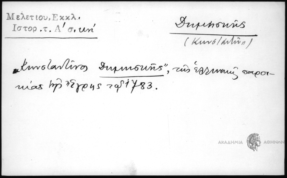 Εκκλησιαστική ιστορία Μελετίου μητροπολίτου Αθηνών. Μετενεχθείσα εκ της ελληνικής εις την ημετέραν απλοελληνικήν φράσιν εις τόμους τρεις... πλουτισθείσα με ... υποσημειώσεις και ... πίνακας παρά Γεωργίου Βενδότη εκ Ζακύνθου... νυν πρώτον τύποις εκδοθείσα δι΄ επιστασίας... Πολυζώη Λαμπανιτζιώτη του ε…