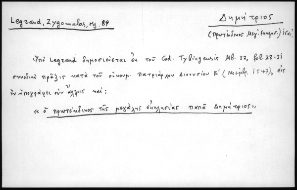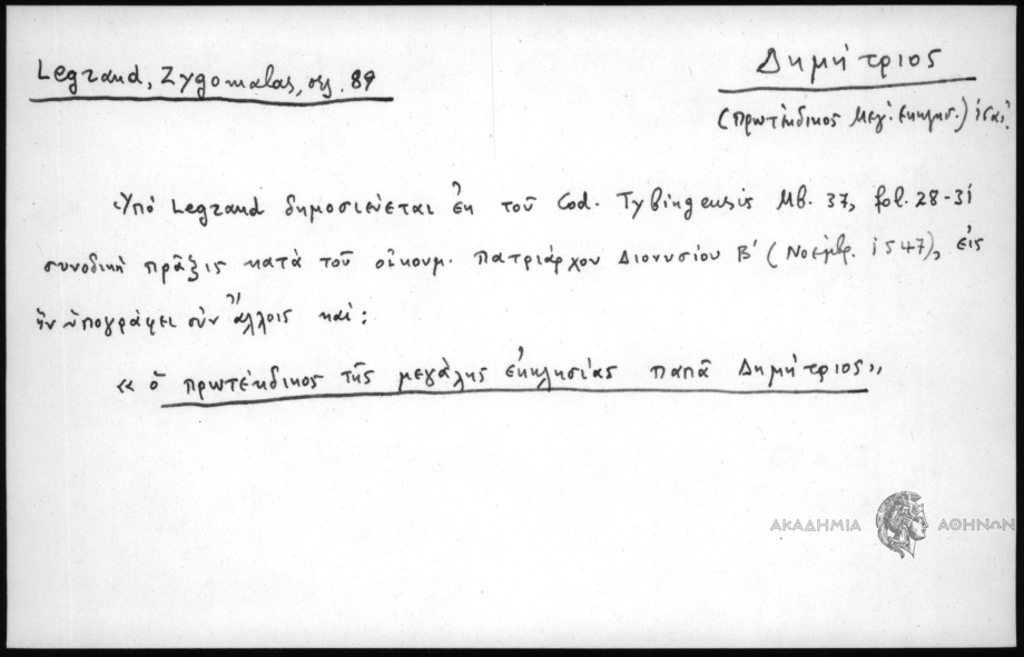 - Υπό Legrand δημοσιεύεται εκ του Cod. Tybingeusur Μβ. 37, fol. 28-31 συνοδική πράξις κατά του οικουμ. πατριάρχου Διονυσίου Β' (Νοεμβρ. 1547), εις ην υπογράφει συν άλλοις και : "ο πρωτέκδικος της μεγάλης εκκλησίας παπά Δημήτριος"