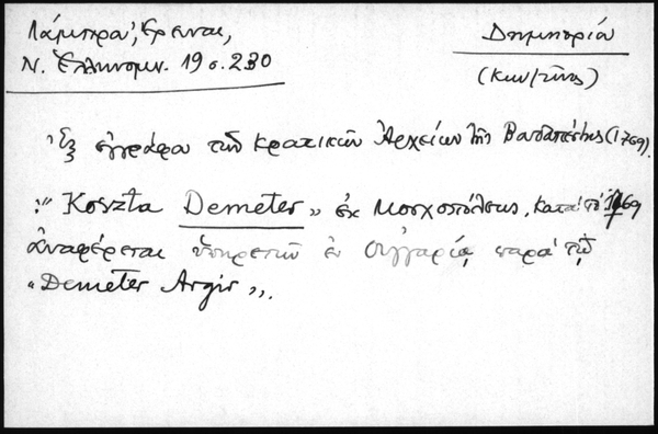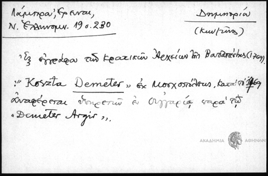 - Εξ εγγράφου των Κρατικών Αρχείων της Βουδαπέστης (1769). : "Koszta Demeter" εκ Μοσχοπόλεως, κατά το 1769 αναφέρεται υπηρετών εν Ουγγαρία παρά τω "Demeter Argir".