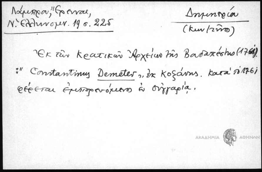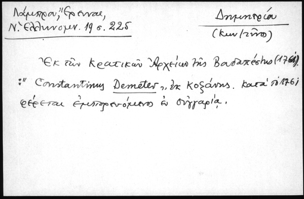 - Έκ των Κρατικών Αρχείων της Βουδαπέστης (161). : "Constantinus Demeter" εκ Κοζάνης. Κατά το 1761 φέρεται εμπορευόμενος εν Ουγγαρία.