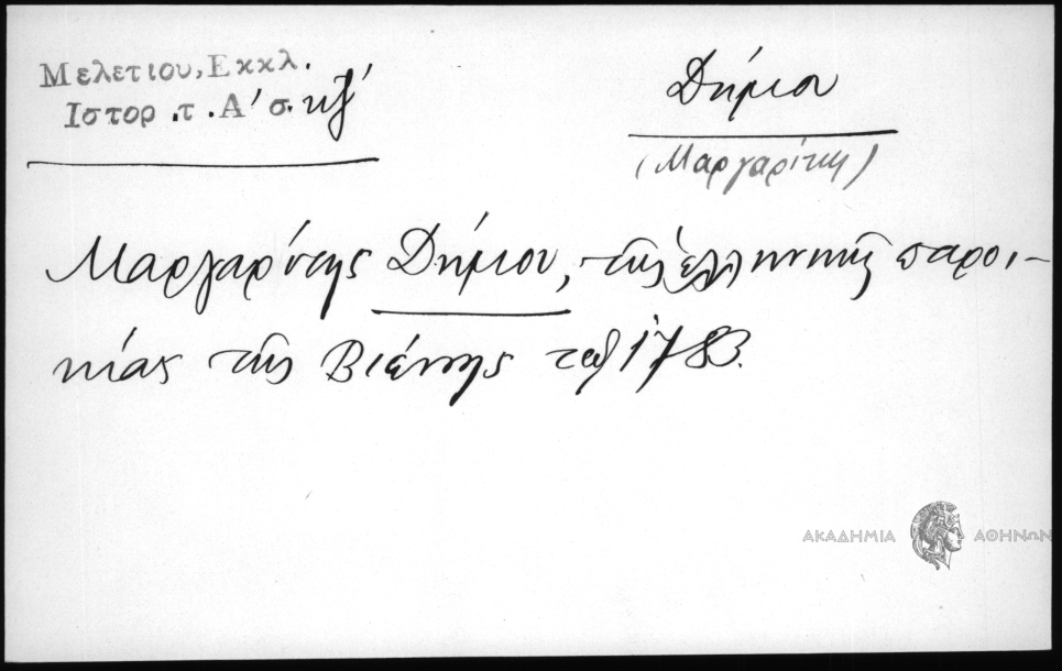 - Μαργαρίτης Δήμου, της ελληνικής παροικίας της Βιέννης τω 1783.
