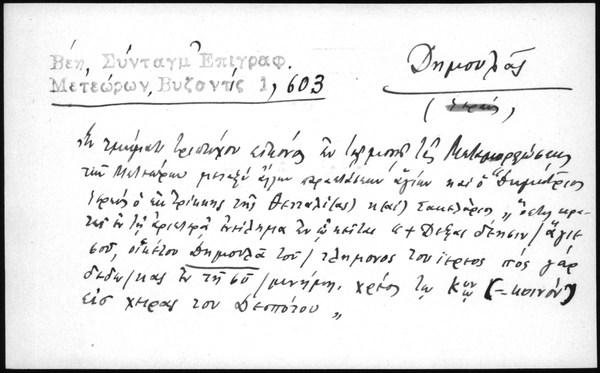 - Εν τμήματι τριπτύχου εικόνος εν Ιερ. μονής της Μεταμορφώσεως των Μετεώρων μεταξύ άλλων παραστάσεων αγίων και ο Δημήτριος ιερεύς ο εκ Τρίκκης της Θετταλί(ας) κ(αι) Σακελάριος" όστις κρατεί εν τη αριστερά ανείλημα εν ω κείται "+Δεξαι δέησιν / άγιε σου, οικέτου Δημουλά του / τλημονος του ιερεος πος γαρ δεδω / κας εν τη συ / μνήμη, χρέος τω Κον (=κοινού) είς χειρας του Δεσπότου."